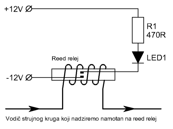 Na shemi vidimo jednostavan indikator ispravnosti nekog trošila. Recimo za kontrolu ispravnosti svjetala u autu. Princip rada je jednostavan. Kada struja teče kroz vodič koji je namotan na reed relej, kontakti se zatvore i upali se LED1 kao indikacija da je sve ispravno, ako pregori žarulja ili neko drugo trošilo, prestane teči struja i LED se gasi. Broj zavoja koje treba namotati na reed relej najbolje odredite eksperimentalno. Na primjer za H4 žarulju od 50W meni je trebalo 6 zavoja žice.