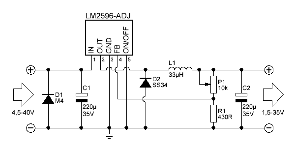 Shema prikazuje Popularni IC LM2596-ADJ pomoću kojeg se s svega nekoliko komponenti može napraviti kvalitetno napajanje. Radi se o buck ili step-down DC-DC pretvaraču koji je idealan za smanjivanje istosmjernog napona na željenu razinu uz minimalne gubitke.