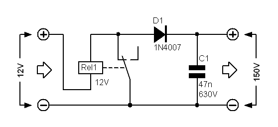 Ova shema se uglavnom koristi za prikaz principa rada SMPS pretvarača napona. Nije namijenjena za stalnu primjenu, ali može poslužiti ako na brzinu trebate podignut neki napon. Relej je spojen da radi kao vibrator, znači kad zavojnica (špula) releja dođe pod napon, privuče normalno zatvoreni kontakt preko kojeg je spojena i sama sebi prekine napajanje. Zatim se vrača u prvobitni položaj i cijeli ciklus počinje iz početka. Kod svakog prekida samoindukcijom se oslobađa energija iz zavojnice koja se ispravlja i filtrira pomoću D1 i C1. Izlazni napon je cca 150V, što ovisi o vrsti releja. Manji t.j. brži releji daju veći izlazni napon a osciliraju na frekvenciji od 100-200Hz.