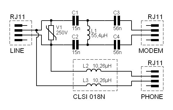 Shema prikazuje ADSL Spliter tipa CoreLogic koji T-Com ugrađuje korisnicima u HR. Napon svih kondenzatora je 400V. Varistor V1 je po mojoj procjeni 250V ali nisam siguran u to. Nema nikakvih oznaka na sebi osim žute crte. Slike rastavljenog splitera možete pogledati u galeriji ispod: