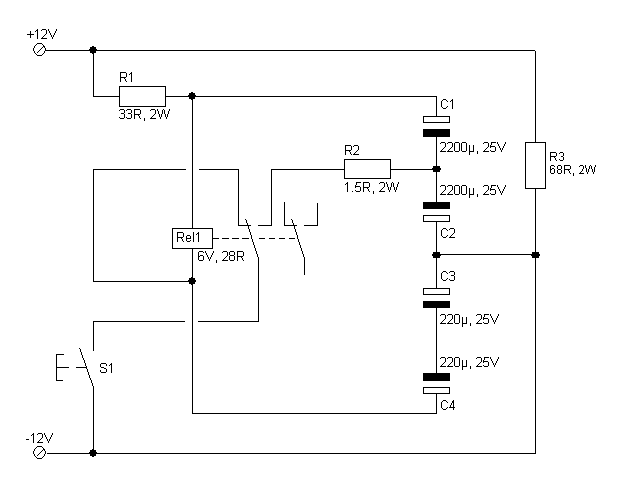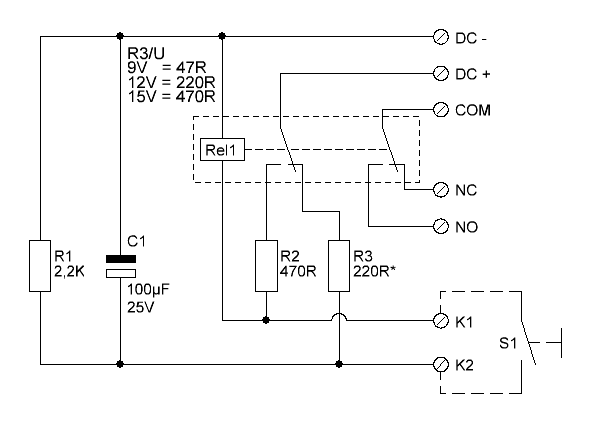 Shema prikazuje kako na jednostavan način napravit bistabil od običnog releja i nekoliko uobičajenih komponenti. Shema je dimenzionirana za napon od 12V i relej od 12V. Sklop će uredno raditi na naponu od 9-15V ali mu u tom slučaju mijenjate otpornik R3, nije loše rješenje ugraditi potenciometar od 470R umjesto R3.
