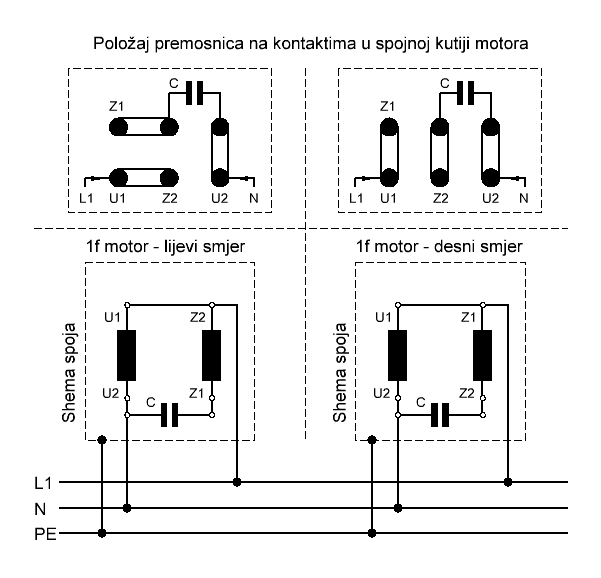 U praksi se najčešće upotrebljavaju jednofazni motori kojima je stalno spojen kondenzator te se iz tog razloga često nazivaju kondenzatorski motori. Jednofazni kavezni asinkroni motor ima dva namota. Glavni i pomoćni, ako neznate koji je koji mjerenjem otpora se lako utvrdi jer je pomoćni uglavnom većeg otpora. Da se jednofazni motor pokrene potreban mu je kondenzator spojen u seriju s pomoćnim namotom koji zakrene struju za određeni kut prema glavnom, upravo se na taj način stvara zakretni moment potreban za rad. Moment se povećava s povečanjem kapaciteta kondenzatora, a za optimalan rad izaberite kondenzator iz dolje dane tablice. Promjena smjera vrtnje se izvodi na način da se jednom namotu zamijene priključci kako je prikazano na shemama u nastavku teksta.