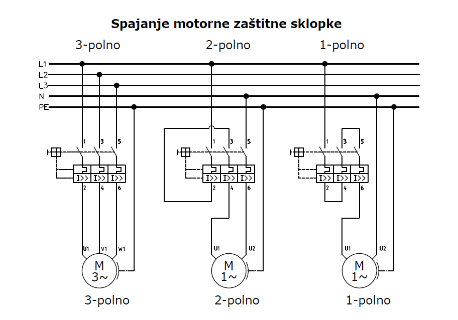 Motorna zaštitna sklopka (MZS) je uređaj koji služi za upravljanje i zaštitu električnog motora. Opremljena je bimetalnom zaštitom za zaštitu od preopterećenja i elektromagnetskom za zaštitu od kratkog spoja. Standardne tipove MZS možete pogledati ovdje, a sheme kako se spaja pogledajte na slici ispod: