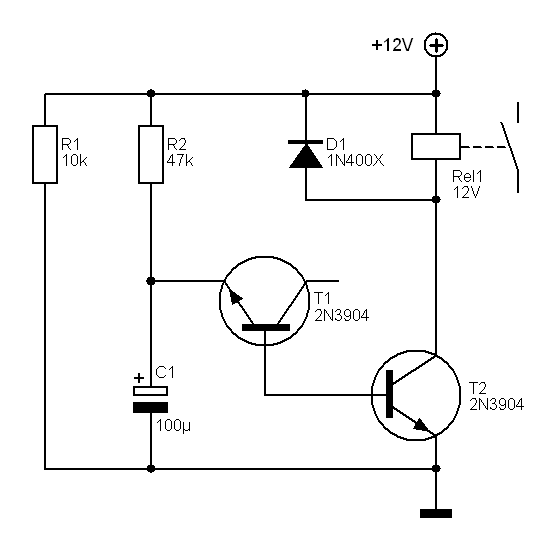 Shema releja za odgodu paljenja. Neobično spojeni tranzistor T1 služi kao zener dioda koja podiže napon prorade tranzistora T2 na 8V. Obični bipolarni tranzistor ima dosta visok napon prorade između emitera i baze, a to je iskorišteno u gore danoj shemi. Vrijeme odgode se podešava promjenom kondenzatora C1. Prema komponentama na shemi to vrijeme iznosi cca 7sec. Relej treba biti 12V sa otporom špule od 75Ω ili više.